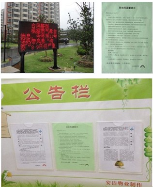 3、台风“海葵”登陆,安洁物业提前在电子显示屏上滚动播出台风警报,并在楼道电梯口张贴防台风温馨提示,提醒业主收回摆放在阳台上的东西,关好门窗减少外出,防止意外发生。