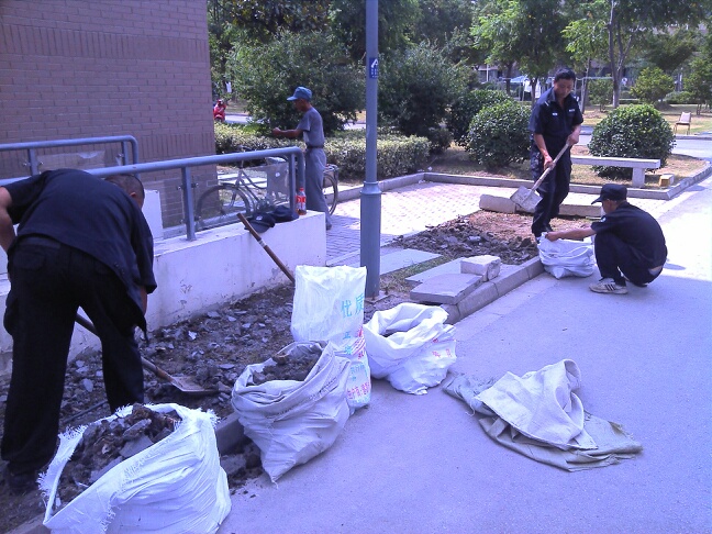 2013年7月22日,安洁物业群星苑员工在日常巡检中,发现群星苑12幢东侧有居民私自在草坪上铺设水泥,导致草坪毁坏。群星苑管理一处负责人到现场核实情况后,找到私铺水泥的居民,进行劝导告知,同时安排保安部和绿化部员工铲除铺设的水泥,对草坪进行重新补种。