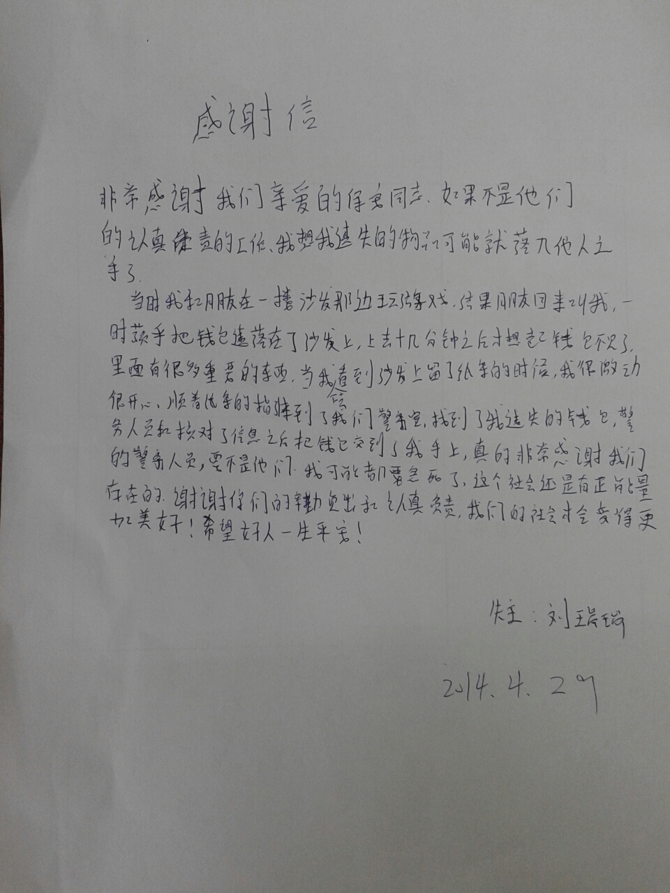 据业主刘先生讲述,2014年4月29日,由于自己的疏忽,把装有重要物品的钱包遗忘在了门厅沙发上,刘先生返回门厅寻找时在沙发上看到了一张字条。原来安洁保安沈小弟在巡视打点时发现了钱包立即交到警务室并在沙发上留下了纸条,刘先生就是看到了这张纸条才找到了警务室,辅警通过信息核对,把钱包还给了刘先生。刘先生非常感动,连赞保安品德高尚。