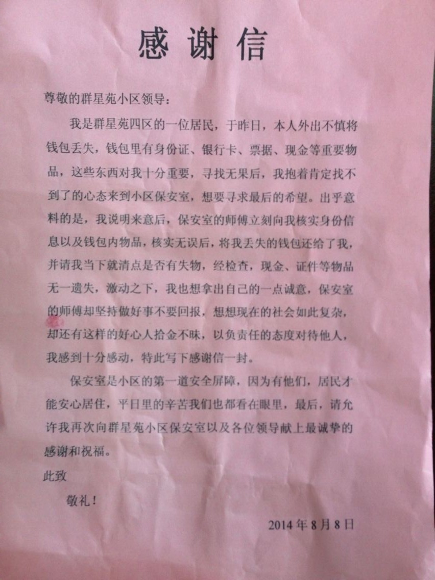 2014年8月8日,安洁物业群星苑管理二处就收到了一封居民送来的长长的感谢信,信上表达了对安洁保安同志的感激之情。