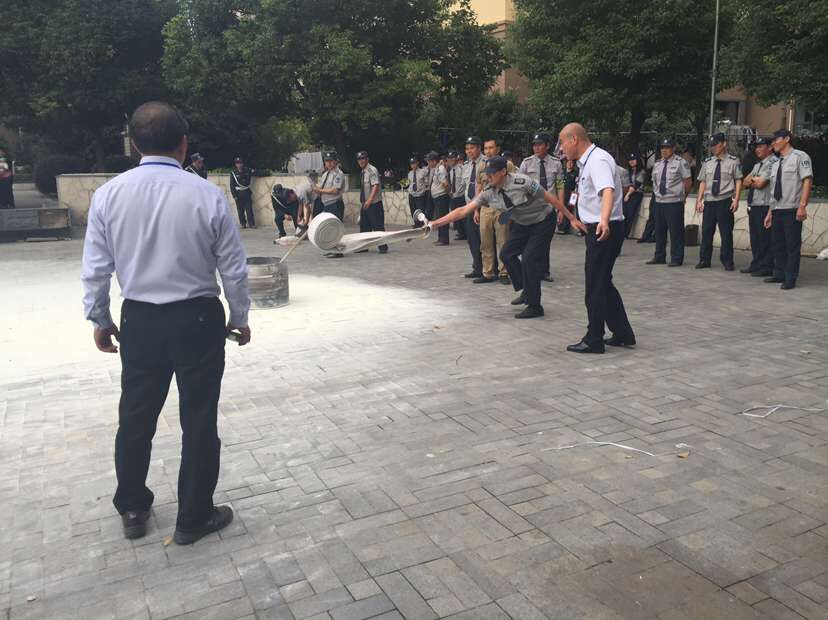 演练开始前,秩序主管向大家讲解了灭火器和消防水带的正确使用方法,并实际操作演示了一遍,确保每位保安队员都学到了正确的操作方法,再组织队员进行实际演练。演练过程中,虽然队员们的操作都没有失误,但在对火情的控制上还存在着些许不足,秩序主管随后针对其中存在的问题做出了进一步指导,确保每一位队员都能够熟练灭火。