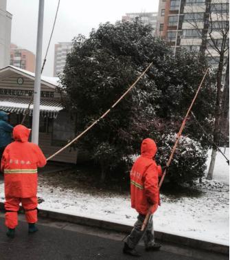 24日晚,大雪如期而至,安洁物业各项目处按照预期准备好的预案忙碌起来。凌晨时分,居民们还沉浸在睡梦中时,秩序队员用草包将斜坡及雪花落在地上形成的水塘一个个填上,避免道路结冰对过往车辆和行人造成不利影响。天蒙蒙亮时,保洁员们就开始用铁锹铲除路面、坡道等危险区域的结冰,用长棍将树上的积雪打落,以免积雪过重压垮树枝伤及无辜,秩序维护员们则帮忙扫除路面、楼道口的积雪,方便居民的出行。在寒冷的天气里大家都干的汗流浃背,争取将下雪造成的影响降到最低。