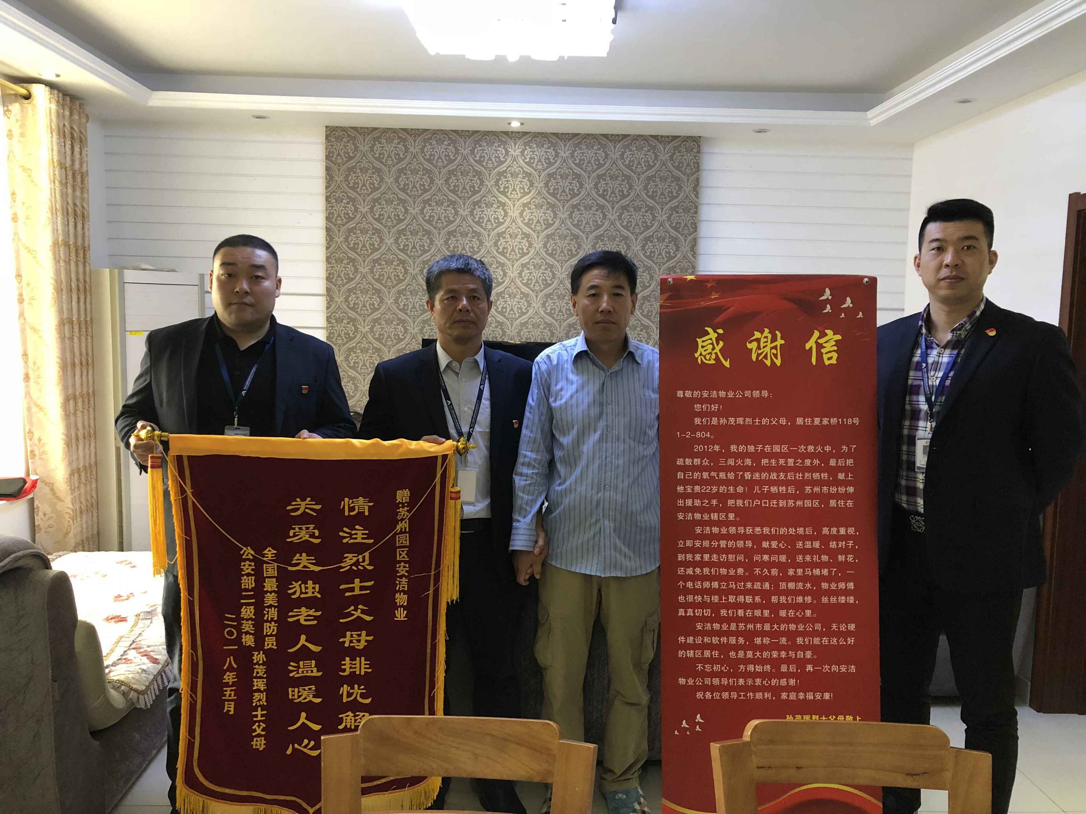 2012年,孙茂珲在园区的一次救火中,为了疏散群众,三闯火海,舍己救人,年仅22岁就付出了宝贵的生命。2016年安洁物业组建了一支志愿者队伍,定期开展“心连心”失独家庭关爱计划。当得知烈士孙茂珲的父母居住在安洁物业辖区内后,公司高度重视,即刻安排志愿者与孙茂珲父母结成对子,定期上门走访慰问,了解他们的生活状况,对其生活中遇到的问题尽可能的给予帮助和解决。今年是烈士孙茂珲牺牲的第六年,每逢清明时节,父母对儿子的想念之情更是挥之不去,因此安洁物业也特意组织党支部代表一行来到孙茂珲父母家中,慰问两位老人,并送上精心准备的礼品。