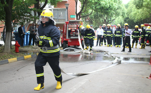 比赛在裁判长及裁判员宣读比赛程序和规则后正式开始,在交接班服务规范展示的比赛中队员们着装规范、步伐整齐,口令清脆洪亮,赢得了在场观众的阵阵掌声。在消防出水操的比赛中各组由三名队员默契配合,随着一声令下,第一名队员抛出一条水带后背水枪,携一盘水带往终点出去;第二名队员在微型消防车后侧泵操作台准备供水;第三名队员操作出水管一端与微型消防车出水口相连,另一端与消火栓相连,待第一名队员举手示意供水,第二三名队员操作车辆向前方供水,同时负责干线水带维护,场面十分精彩刺激。