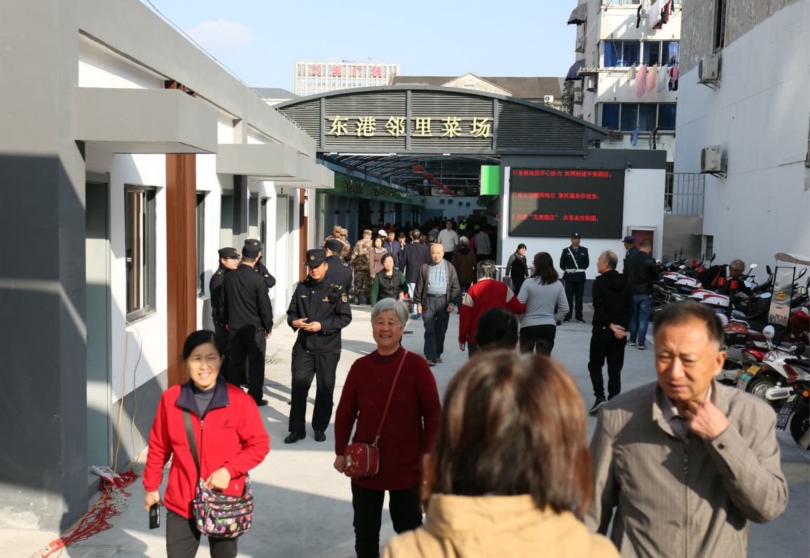 东港邻里菜场是娄葑街道东港新村环境综合整治工作中的“亮点”工程,一方面承担改善老旧小区居民生活品质,提升老旧小区居民幸福感、获得感;另一方面给园区老旧新村改造提升树立“样板”。升级后的东港邻里菜场共有84间商铺及58个摊位,是一个集智慧化、智能化、数据化、食品安全可追溯化于一体的“智慧菜场”,以“新鲜、平价、优质、便利”为经营理念,倡导贴心、便利的全方位服务,给广大居民提供必须的物质需求。在东港邻里菜场内还有为贵州松桃县的大米、茶叶、茶油等土特产搭建的展示窗口,这是市场方与民政部门对接,在党建引领下与贵州铜仁松桃县对口扶贫专门设立的爱心平台,同时在菜场功能上还增设了便民服务点。