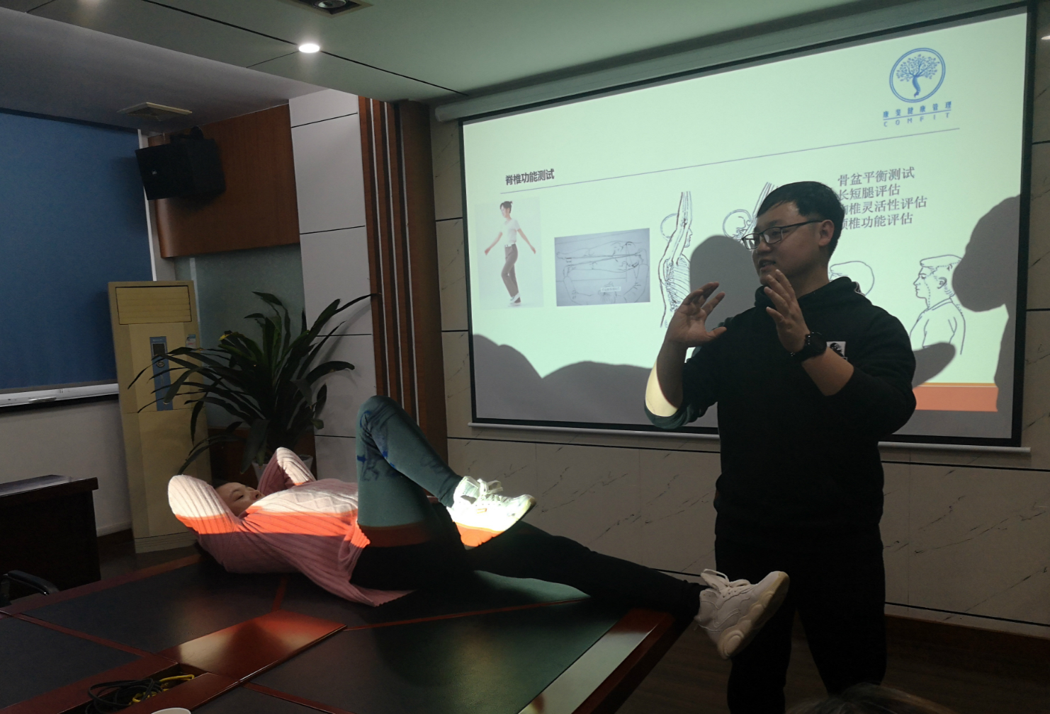 讲座上,袁教授分别从认识脊椎、日常不良姿势习惯对脊椎健康的危害、常见相关疼痛的预防与运动康复等方面,向大家生动的讲述了保养脊椎的重要性及方法,通过案例生动形象地讲述了现代人用电脑、玩手机、长时间保持单一姿势不变动所带来的危害。同时,讲师还通过现场演示介绍了一些进行结构功能异常自我检测的简单方法,例如一分钟闭眼原地踏步走,通过走路的轨迹可以轻易看出骨盆是否存在歪斜等等。整场讲座既有理论高度,又有很强的针对性和指导性,受到了在场职工的一致好评。