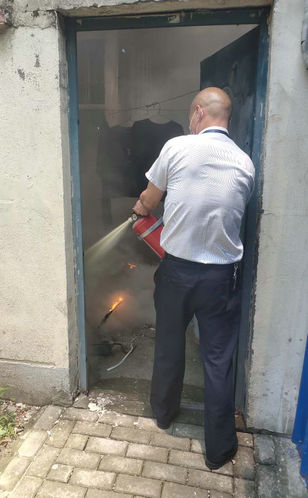 刘忠看到浓烟后立即意识到有火情发生,于是赶快飞奔到对面单元楼内拿了灭火器并快速返回,但是敲门多次后仍无人应答,他果断抬起一脚破门而入,此时火势已蔓延开来而且越烧越旺。“快救火!”,刘忠脑海里只环绕着这一个声音,他熟练操作灭火器对准火焰来回喷射,连着用了四个灭火器才控制住了火势,随后赶来的消防队确认火势已被完全扑灭。经现场勘查后发现,该户居民院子里堆放着杂物,被楼上住户扔出的烟头点燃才导致的火灾发生,所幸及时发现并得到有效扑救,没有造成人员伤亡。