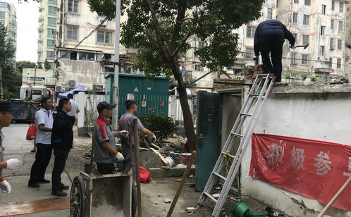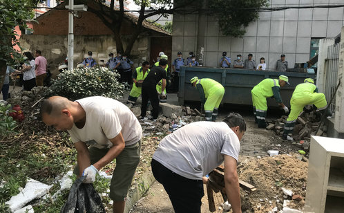 由于无物业小区大都无专人清理,无疑使进驻工作难度大大提高。为使“开荒”工作迅速推进,安洁物业发挥党建引领作用,6月30日,联合安洁工会、团委、妇联等在东淳苑开展了“开荒保洁”活动。此外,7月27日,由社区、物管会、派出所、城管、环卫站、安洁物业组成的“环境整治联合突击队”,突破了联合执法的工作交接、组织协调、人员分配与居民沟通等种种困难,携手作战,对东淳苑小区围墙、店面后墙的违规开门进行了封闭,在东淳苑36幢公共平台清理了近二十车的堆积杂物。自此,无物业小区脏乱差的生活环境彻底改换新颜,整齐有序、干净卫生成为了小区新的形容词。