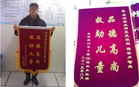 2013年2月2日下午1点,安洁物业管辖的夏家桥118号的门卫保安卢智兵在小区门口发现一名6岁的小孩在独自哭泣,遂上前询问情况,得知小孩与奶奶在欧尚超市购物时走散,独自一人走回小区,但由于幼儿年龄太小只记得是住在12楼具体幢数说不清楚,于是卢智兵边安抚幼儿边带着他逐幢寻找。当找到4幢12层某室时,开门的正是幼儿爷爷,经过幼儿的确认,卢智兵将幼儿交到了爷爷手中,并提醒家人通知仍在超市寻找幼儿的奶奶,令其放心。