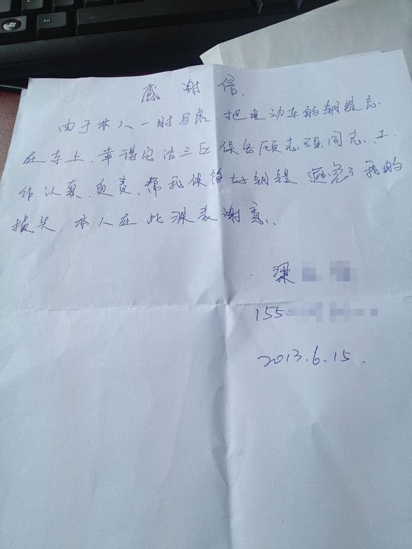 近日,群星苑三、四区多次发生业主将电瓶车钥匙忘在车上或者家门钥匙插在门上的情况,对此安洁物业保安在日常巡逻时,本着工作认真为业主负责的态度,主动帮粗心的业主妥善保管好钥匙,事后及时找到业主将钥匙完璧归赵。目前,安洁物业保安部已先后收到两份业主送来的感谢信,感谢安洁保安工作负责,全心全意为业主服务。